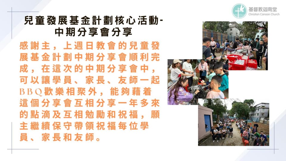 兒童發展基金計劃核心活動-中期分享會分享 最新消息 • Apr 25, 2026 感謝主,上週日教會的兒童發展基金計劃中期分享會順利完成,在這次的中期分享會中,可以讓學員、家長、友師一起BBQ歡樂相聚外,能夠藉着這個分享會互相分享一年多來的點滴及互相勉勵和祝福,願主繼續保守帶領祝福每位學員、家長和友師。 Recommended for you 最新消息 兒童發展基金 - 箭略競技活動 8 months ago • 1 min read 兒童發展基金計劃 過去活動 模擬人生遊戲 8 months ago • 1 min read 兒童發展基金計劃 過去活動 家長財務管理講座 9 months ago • 1 min read