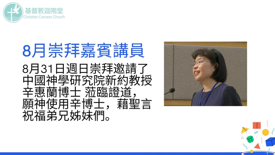 8月崇拜嘉賓講員 最新消息 • Oct 11, 2025 8月31日週日崇拜邀請了中國神學研究院新約教授辛惠蘭博士 蒞臨證道,願神使用辛博士,藉聖言祝福弟兄姊妹們。 Recommended for you 最新消息 決志報告 8 days ago • 1 min read 最新消息 毒海浮沉逆轉人生福音主日 2 months ago • 1 min read 最新消息 2025年轉會及浸禮班 2 months ago • 1 min read
