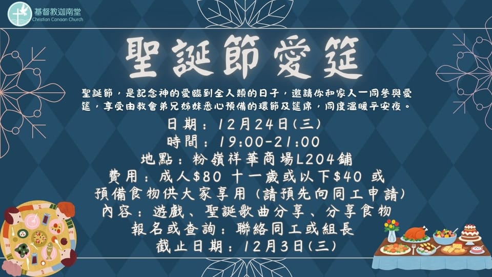 聖誕節愛筵 最新消息 • Dec 2, 2025 聖誕節,是記念神的愛臨到全人類的日子,邀請你和家人一同參與愛筵,享受由教會弟兄姊妹悉心預備的環節及連席,同度溫暖平安夜。日期: 12月24日(二)時間: 19:00-21:00地點: 粉嶺祥華商場L204舖費用: 成人$80 十一歲或以下$40 或預備食物供大家享用(請預先向同工申請)內容: 遊戲、聖誕歌曲分享、分享食物報名或查詢: 聯絡同工或組長截止日期: 12月3日(二) Recommended for you 最新消息 2025浸禮、轉會禮暨聖誕崇拜 5 days ago • 1 min read 最新消息 決志報告 2 months ago • 1 min read 最新消息 8月崇拜嘉賓講員 2 months ago • 1 min read