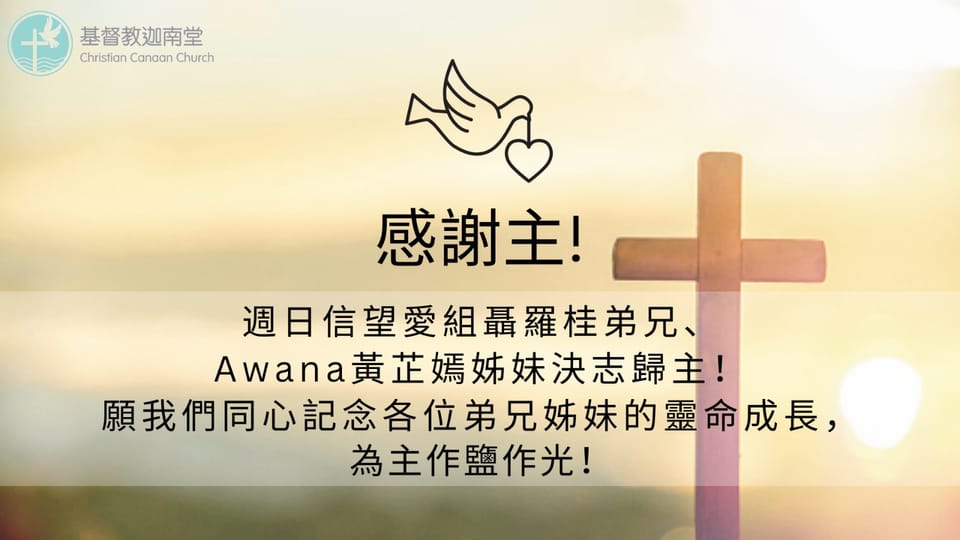 決志感恩 最新消息 • Feb 7, 2026 感謝主!週日信望愛組黃羅桂弟兄、Awana黃芷媽姊妹決志歸主!願我們同心記念各位弟兄姊妹的靈命成長,為主作鹽作光! Recommended for you 最新消息 兒童發展基金 - 箭略競技活動 6 months ago • 1 min read 最新消息 友伴我翱翔 兒童發展基金(第九期) 結業禮 a year ago • 最新消息 本堂兒童發展基金計劃之報道 a year ago • 1 min read